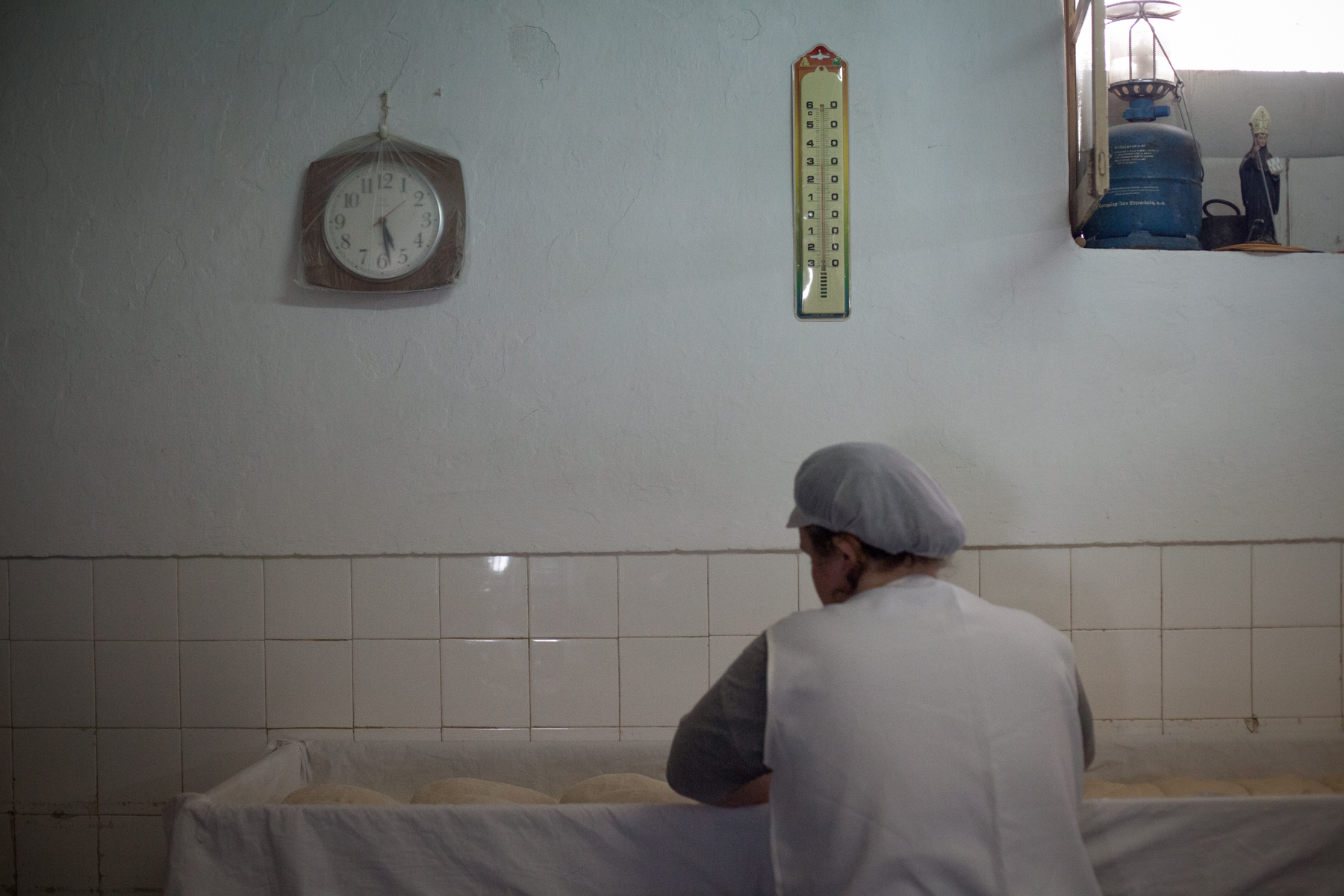 Owning the sole bakery in the village, he and his apprentice, Maria, produce the same loaf and the same number (around 130) every day to satisfy demand from the local villagers.
