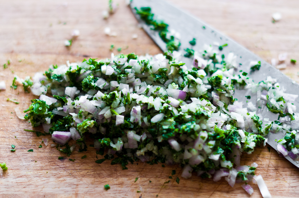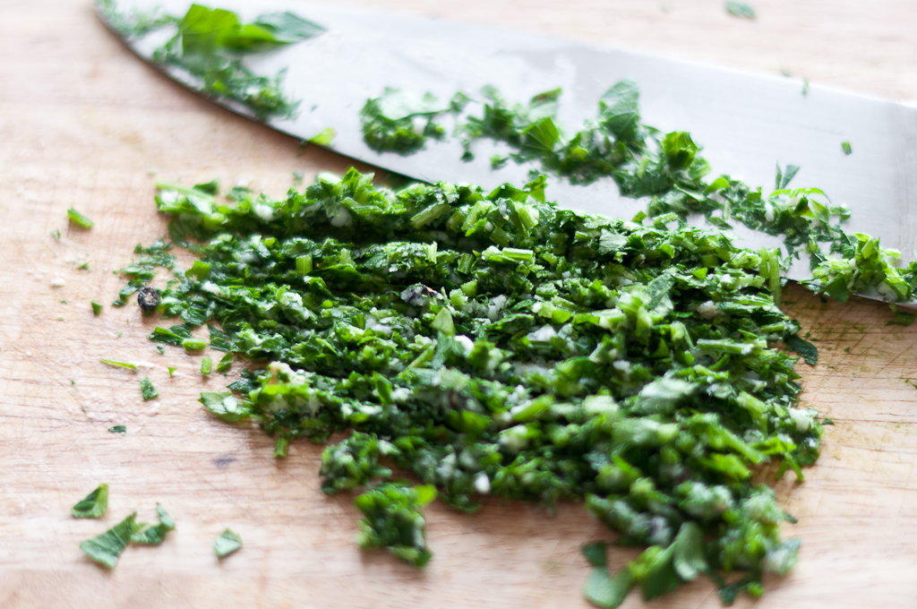 Using a sharp chef knife, start mincing the lardo until you get a sort of paste. Chop the parsley very finely and then incorporate it into the creamed lardo. Do the same with the onion. You want to end up with almost a pesto of parsley, lardo and onion.